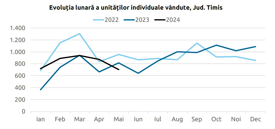 Compared to historical data published by ANCPI, the most prolific period for real estate transactions in Timiș County was 2021, when 12,476 units were sold. On the other hand, 2019 was the year with the fewest transactions, recording only 6,493 units. Despite a 10.3% decline in total sales for 2023, with 10,215 units sold, the positive trend in the first months of 2024 suggests a strong recovery.