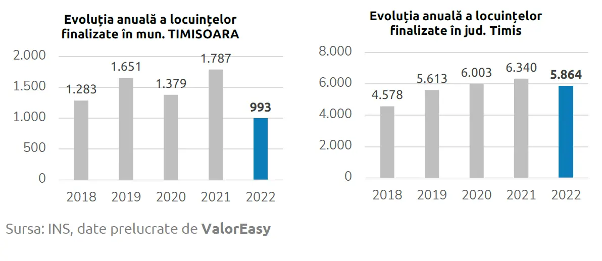 Although real estate transactions are increasing, new housing deliveries in Timișoara have declined. In 2022, 993 homes were completed, a significant decrease compared to the 1,787 units delivered in 2021, representing a 44% drop. This trend is also reflected in the data for the West region, where the volume of completed homes in the first quarter of 2024 was 1,274, 122 fewer than in the same period in 2023.