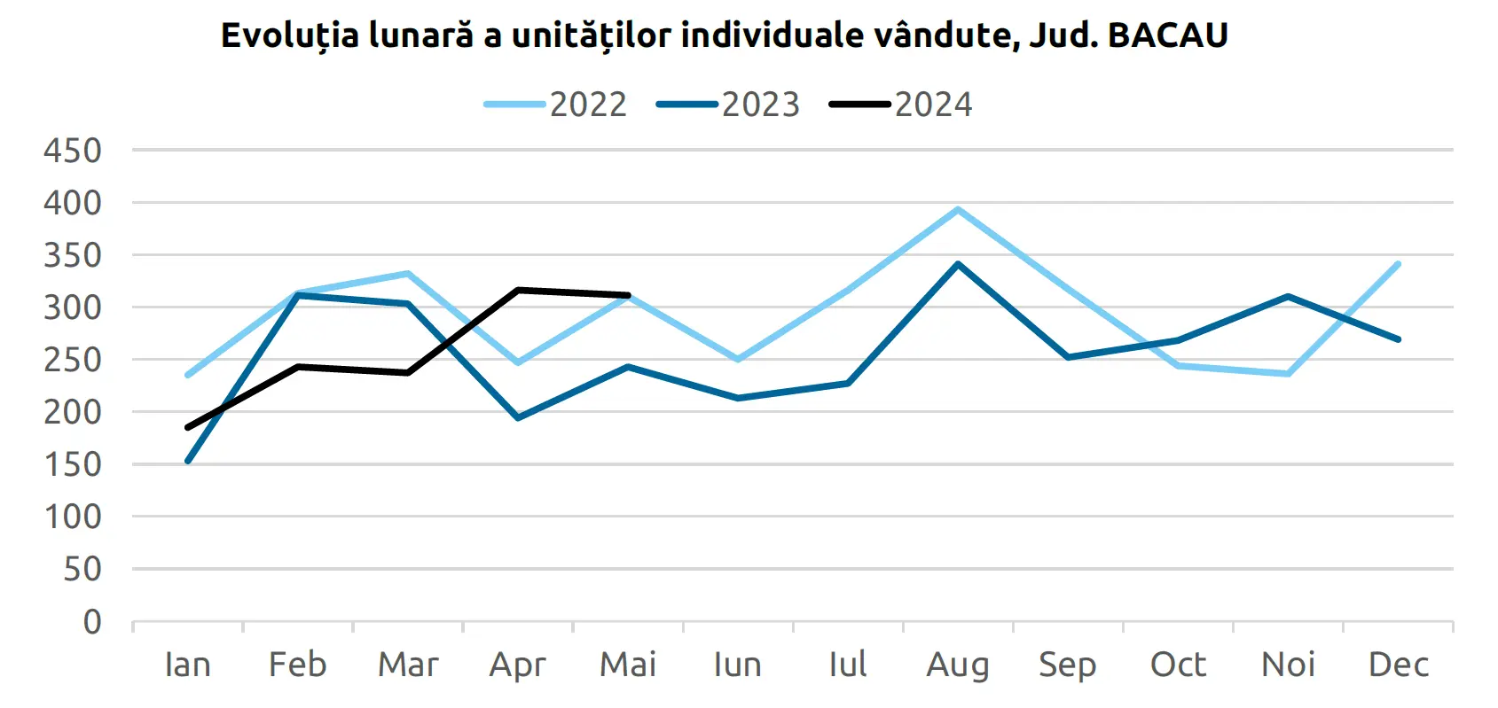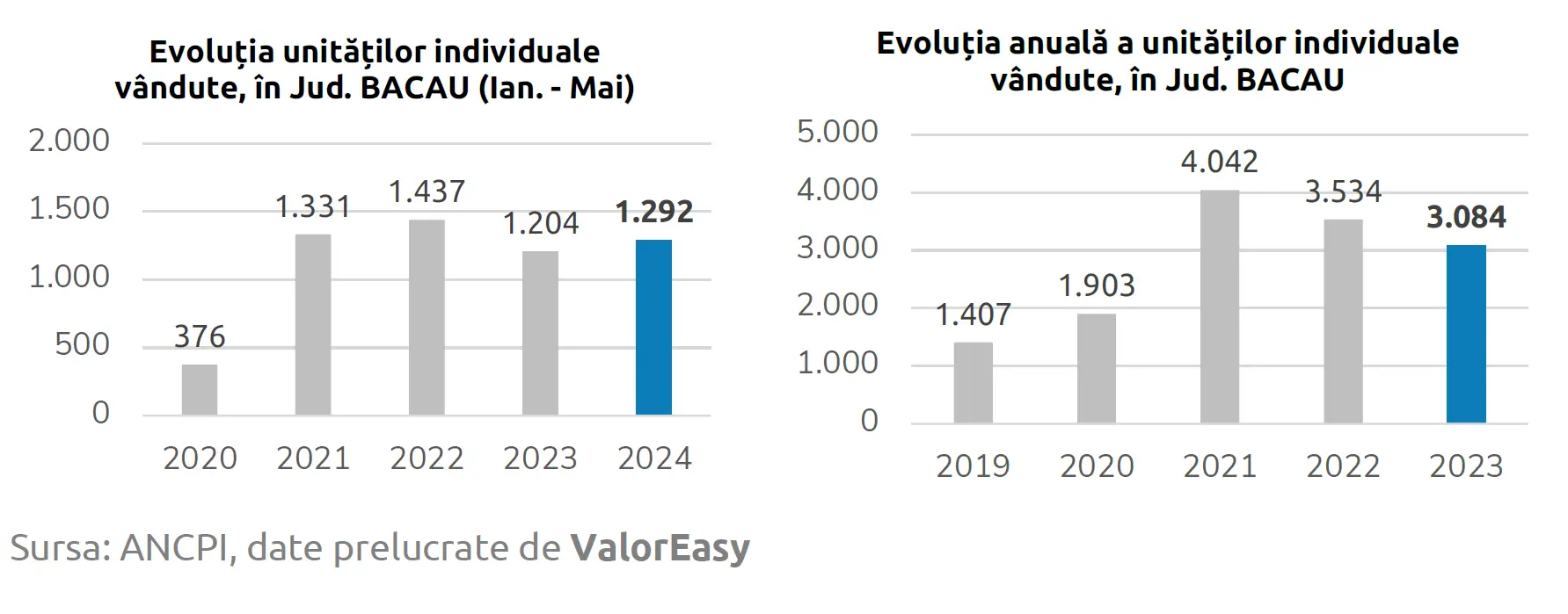 În primele cinci luni ale anului 2024, județul Bacău a înregistrat o activitate intensă în piața imobiliară, cu un total de 1.290 de unități individuale vândute, comparativ cu 1.200 în aceeași perioadă a anului anterior. Aceasta reflectă o creștere de 7,5% în volumul tranzacțiilor.