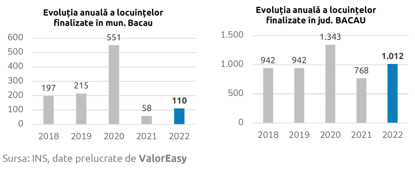 În municipiul Bacău, livrările de case și apartamente au cunoscut fluctuații semnificative. Spre exemplu, în 2022 au fost finalizate 110 locuințe, în creștere cu 90% față de 2021, dar în scădere comparativ cu 2020, an în care au fost terminate 551 de unități locative.