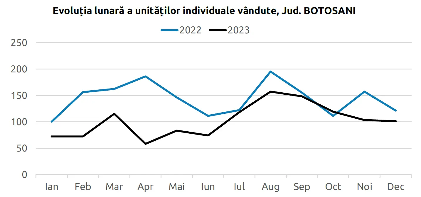 În trimestrul final al anului 2023, situația nu s-a îmbunătățit, cu doar 323 de unități individuale vândute în județul Botoșani, marcând o scădere de 17% față de anul precedent.
