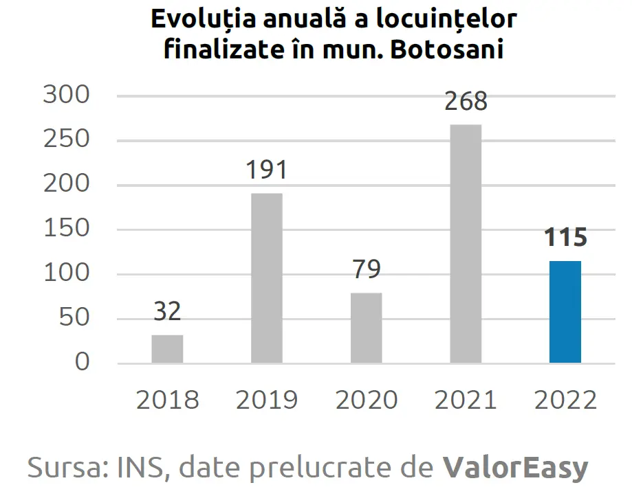 Comparând datele istorice furnizate de Institutul Național de Statistică (INS), se observă că municipiul Botoșani a înregistrat cel mai mare număr de finalizări de locuințe în 2021, cu 268 de unități, în timp ce cel mai scăzut nivel a fost înregistrat în 2018, cu doar 32 de locuințe finalizate.