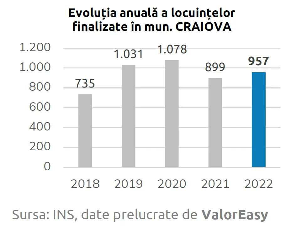 În contrast cu scăderea tranzacțiilor individuale, municipiul Craiova a înregistrat o creștere în livrările de locuințe noi în 2023. Conform datelor INS, în 2022 au fost date în folosință 957 de locuințe, în creștere față de anul precedent. Comparând datele istorice, se observă că cele mai multe locuințe au fost finalizate în 2020, în timp ce cel mai mic număr a fost înregistrat în 2016.