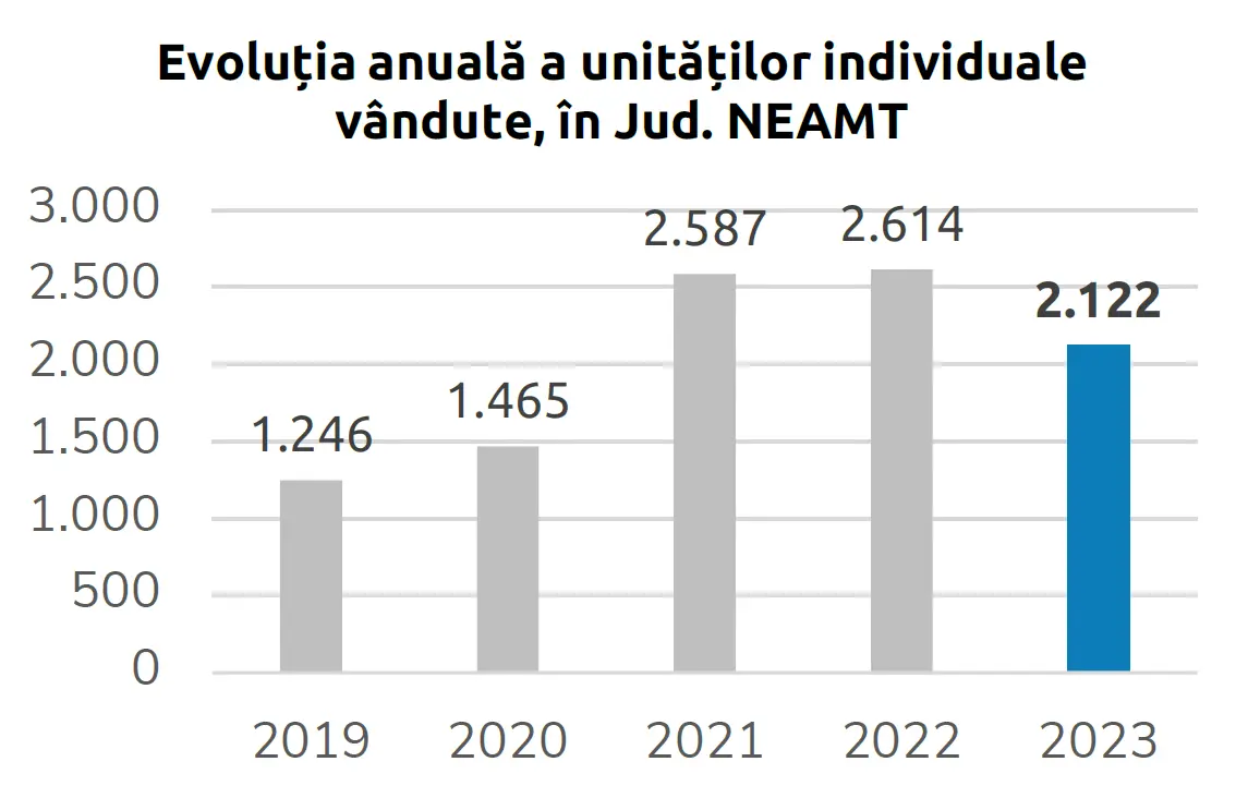 În 2023, în întreaga țară au fost vândute aproape 160.000 de unități individuale, înregistrând o scădere anuală de 9,7%. În județul Neamț, această reducere a fost chiar mai pronunțată, cu o diminuare de 18,8%.