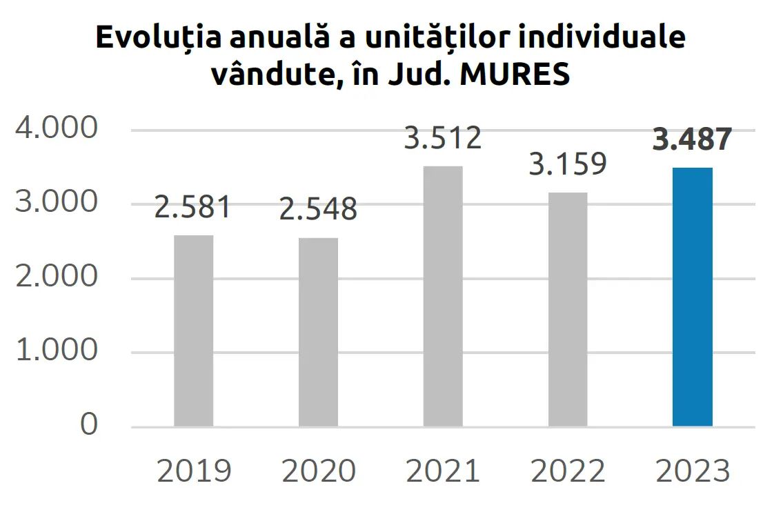 În ciuda unei tendințe generale de scădere a tranzacțiilor la nivel național, județul Mureș a înregistrat o revenire puternică în a doua jumătate a anului 2023. Cu un total de 3.487 de tranzacții înregistrate, o creștere anuală de 10,4% a fost înregistrată. Această tendință ascendentă, tradusă în 328 de tranzacții în plus față de anul precedent, indică un interes crescut din partea investitorilor și cumpărătorilor.