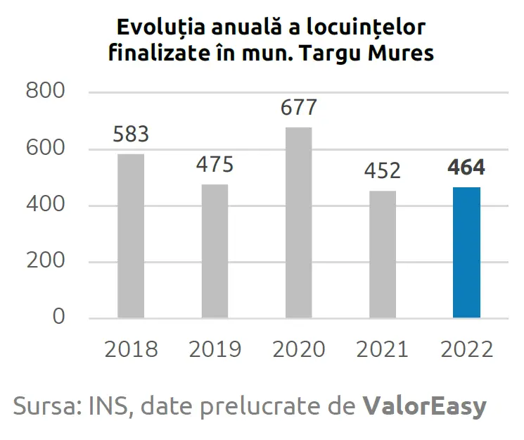 Într-un context național caracterizat de o ușoară scădere a lucrărilor în construcțiile rezidențiale în 2023, municipiul Târgu Mureș a păstrat un ritm stabil în ceea ce privește finalizarea de locuințe noi. Deși în 2022 au fost terminate 464 de locuințe, iar în 2021 s-au construit 452, aceste cifre arată o continuitate în dezvoltarea pieței imobiliare locale.