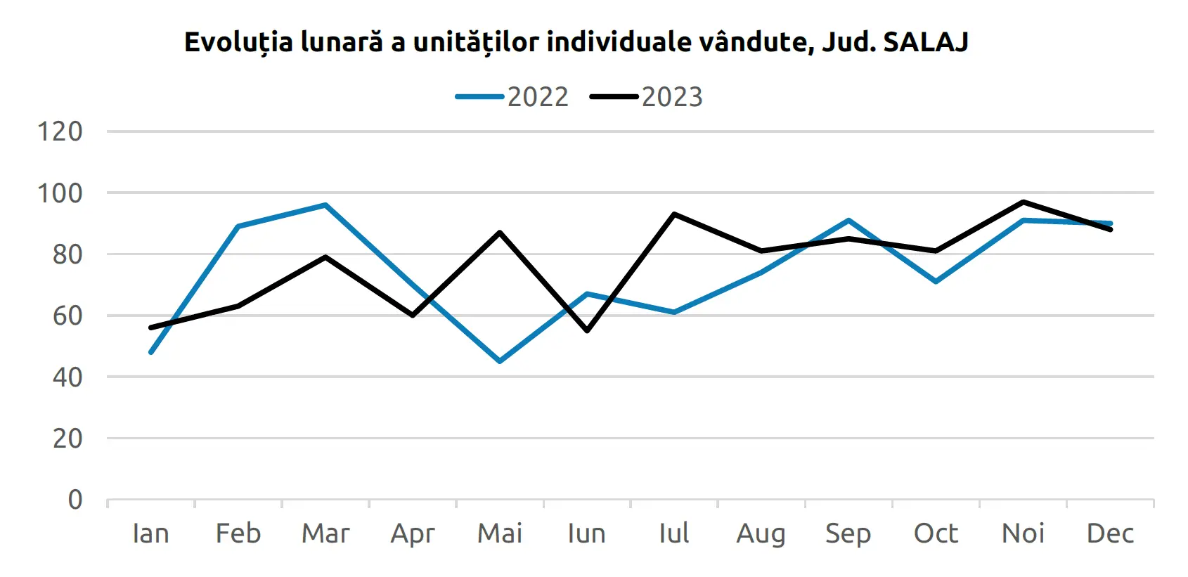 La nivel național, în 2023, au fost tranzacționate aproximativ 160.000 de unități individuale, în scădere cu 9,7% comparativ cu anul precedent. Spre deosebire de tendința generală, județul Sălaj a reușit să își mențină și chiar să îmbunătățească performanțele în această perioadă dificilă. În ultimul trimestru din 2023, au fost vândute 266 de unități, cu 14 unități mai multe decât în aceeași perioadă din 2022, ceea ce indică o creștere de 5,6%.
